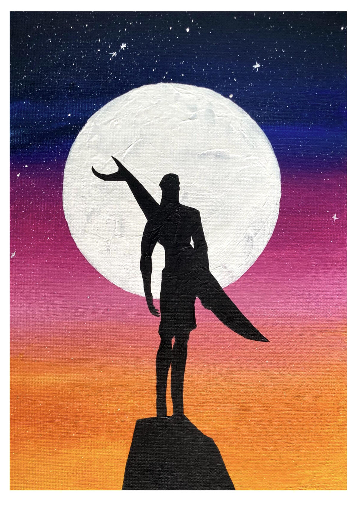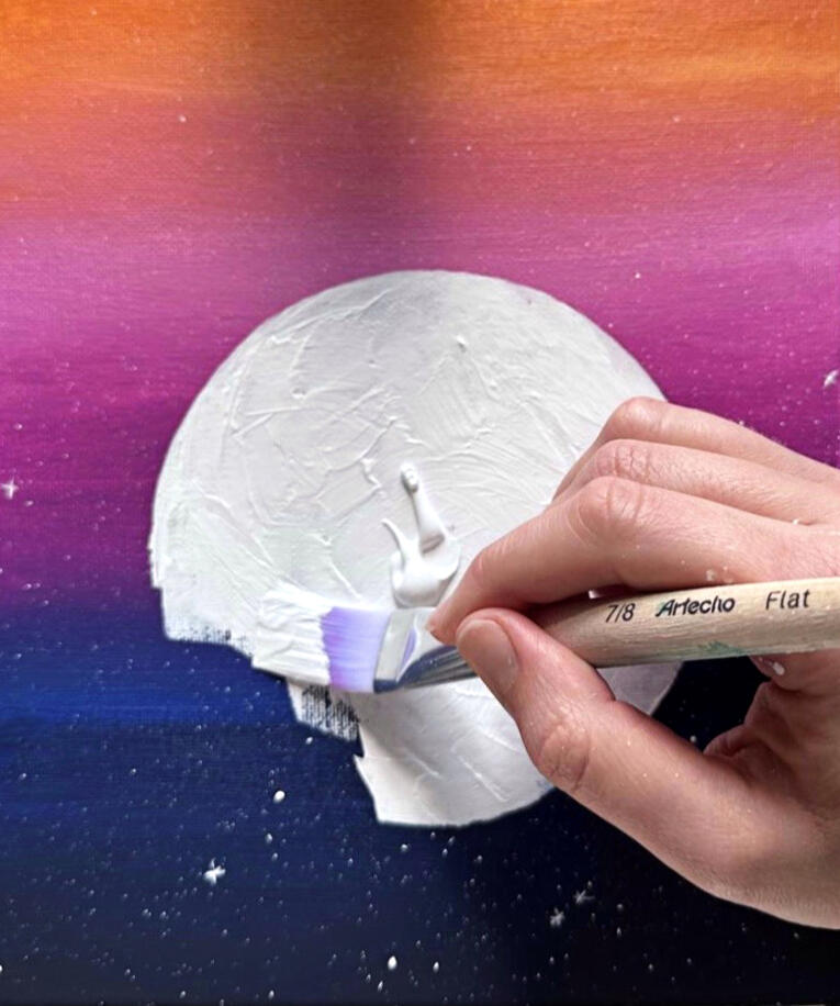 Create the Guardian of Ericeira using acrylic paints and explore the art of smooth color gradients. This technique allows you to blend soft hues seamlessly, creating a dreamy sky and tranquil moonlit scene. The moon, the stars, and subtle reflections will bring a magical, serene atmosphere to your artwork, making it come to life.